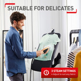 با استفاده از اتو ایستاده تفال از یک سیستم بخاردهی و مراقبت پیشرفته از پوشاک بهرهمند شوید. این اتو قابلیت استفاده روی تمامی انواع جنس پارچههای لباس، حتی ظریفترین نوع آن مثل ابریشم را بدون نیاز به تنظیمات قبلی دارد.