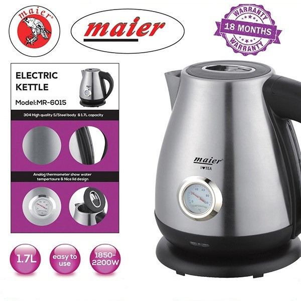 کتری برقی مایر وسیله ای است که با استفاده از برق آب را به جوش می آورد. از این دستگاه برای تهیه چای، قهوه و انواع نوشیدنی ها استفاده می شود. کتری برقی مایر مدل MR-6015 دارای توان 2200 وات می باشد . از مزایای این کتری برقی می توان به المنت حرارتی مخفی، قطع کن خودکار و گیج نشان دهنده دمای آب اشاره نمود.