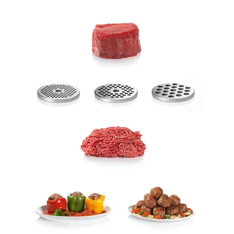 بکارگیری از ۳ شبکه برای تهیه گوشت در اندازهای مختلف یکی از ویژگیهای این دستگاه است. شبکه با قطر ۳ میلیمتر برای ریز، شبکه با قطر ۴/۸ میلیمتر برای متوسط و ۸ میلیمتری برای درشت چرخ کردن گوشت بخش مهمی از اقلام قابل پیوست این محصول را تشکیل میدهد.