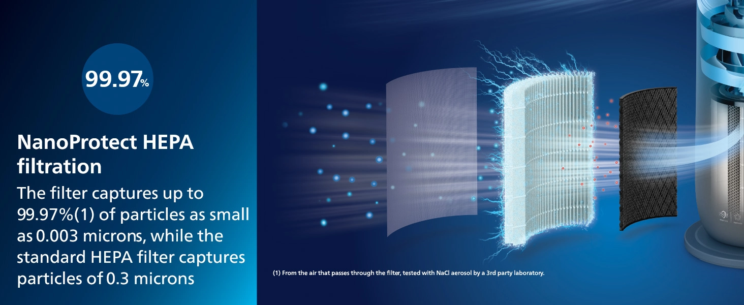 هوای پاک را در تمام طول سال تجربه کنید: فناوری NanoProtect HEPA 99.97 درصد از آلاینده ها را حذف می کند (1). از محیط داخلی سالم تری با محافظت در برابر گرده، گرد و غبار، ویروس ها، باکتری ها، شوره حیوانات خانگی، کنه های گرد و غبار، هاگ های کپک، بو و غیره لذت ببرید. اتاق ها تا 70 متر مربع (4) را با CADR قدرتمند 270 متر مکعب در ساعت (3) پوشش می دهد.