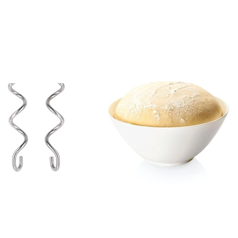 وجود دو میله همزن موسوم به FINE CREAMER از جنس استیل ضدزنگ کار کردن را برای شما آسانتر میکند. این میلهها بهگونهای طراحی شدند تا با استفاده از آن به مواد غذایی خود پف و حجم بسیار بیشتری را بدهید و به پخت ایدهآل مواد غذایی خود برسید. برخورداری از توپهای کوچک تعبیه شده در مکانیزم ساخت این میلهها موجب ایجاد هوای خالی داخل خمیر شده؛ بنابراین ترکیب داری حجم و پف بیشتری خواهد شد. علاوه بر این وجود دو قلاب استیل ضدزنگ بهمنظور سهولت در ورز دادن خمیر نان و پیتزا و ترکیبات چالشبرانگیز بهعنوان دیگر ابزار جانبی در این دستگاه تعبیه شده است. میلههای همزن و خمیرزن را به آسانی میتوان زیر شیر آب تمیز کرد و یا داخل ماشین ظرفشویی گذاشت تا با استفاده از آن قطعات شستشو داده شوند.