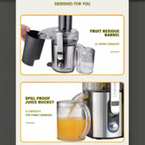 شما به راحتی می توانید قطعات بزرگ میوه و سبزیجات را از طریق لوله 83 میلی متری به آبمیوه گیری مدل KJ3057 اضافه کنید. این آبمیوه گیری دارای بدنه محکم و مقاومی بوده که دارای قفل فلزی گیره ای است که تمام قطعات را ایمن نگه می دارد. بدنه این دستگاه از فولاد ضد زنگ بوده که باعث می شود با کیفیت بالا و بادوام برای استفاده روزانه استفاده شود. این دستگاه با ولتاژ 220 ولت کار می کند و عملکرد قدرتمند و کارآمد را تضمین می کند. همچنین این دستگاه به شما امکان می دهد سرعت مناسب را با دو گزینه از 14000 تا 18000 دور در دقیقه انتخاب کنید.