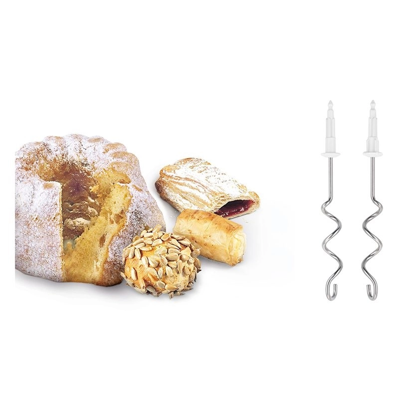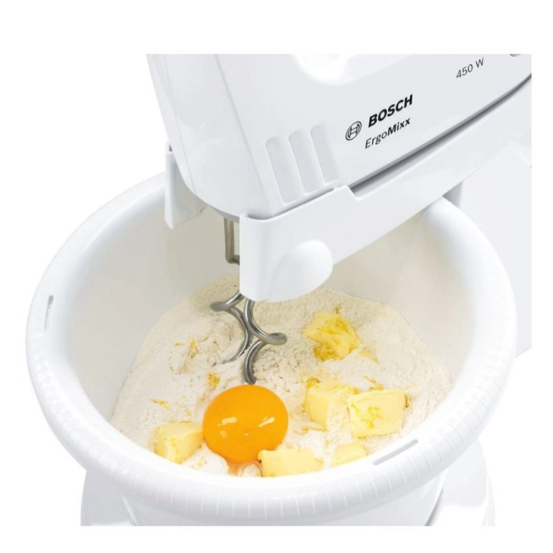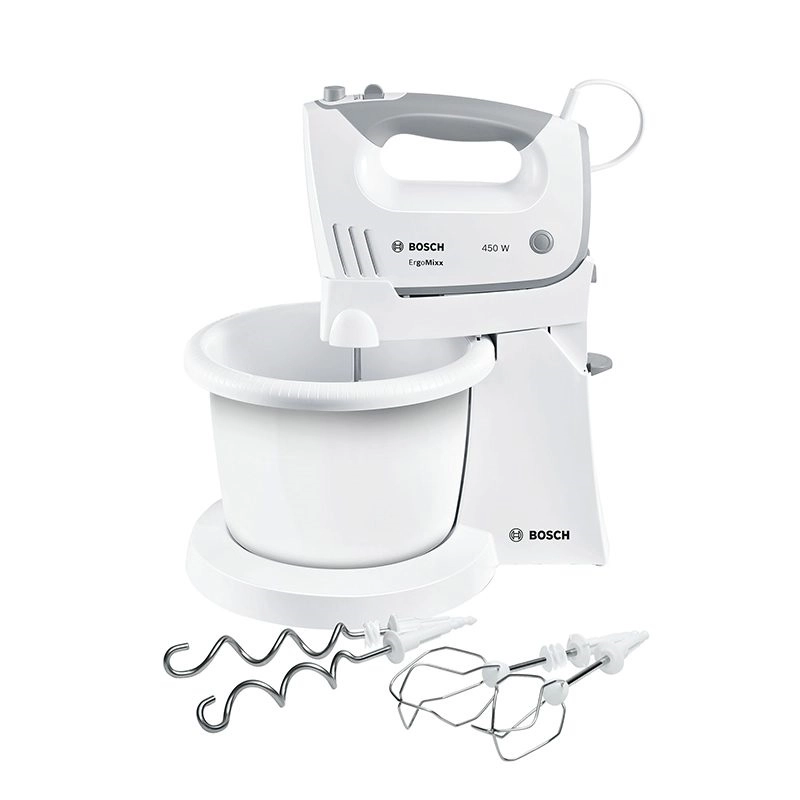 همزن کاسه دار بوش مدل MFQ36460، با توان 450 وات جهت هم زدن و مخلوط کردن مواد غذایی مختلف طراحی شده است. همزن بوش مجهز به 5 سرعت مختلف و همچنین عملکرد توربو می باشد که می توان با توجه به نوع مواد غذایی سرعت مناسب را انتخاب نمود. سرعت دستگاه را می توان به سهولت و فقط با فشار دادن انگشت شست بر روی دکمه سرعت، کنترل نمود. کاسه بزرگ همزن بوش گنجایش لازم را برای حجم بالایی از مواد غذایی فراهم می کند. این کاسه به صورت چرخان طراحی شده است و این ویژگی موجب ترکیب شدن یکنواخت و کامل مواد داخل کاسه و بدست آمدن نتیجه بهتر می شود. این همزن را می توان با دو جفت سری استیل همزن و خمیرزن برای تهیه انواع خامه و خمیر استفاده کرد که این سری به راحتی با فشردن دکمه خروج قابل جداسازی از بدنه هستند. برای جداسازی همزن و کاسه از پایه نگهدارنده یک دکمه Eject روی پایه تعبیه شده که به آسانی با فشردن آن صورت می گیرد.