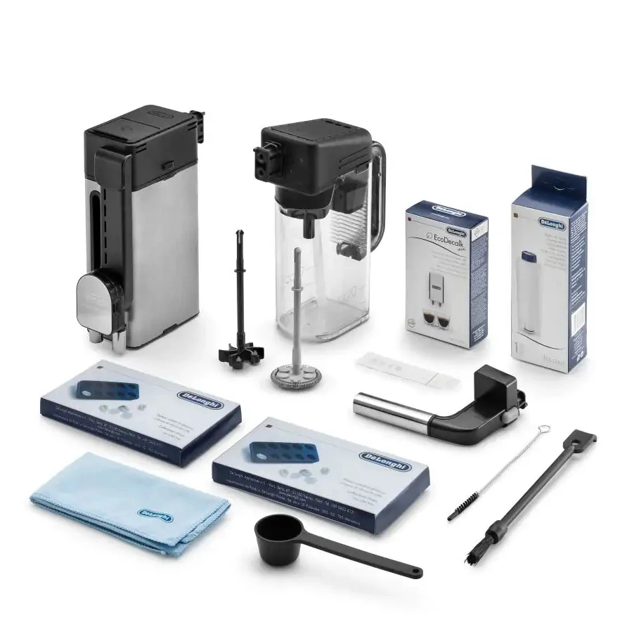 لوازمی همچون پیمانه قهوه، تنظیم گر میزان سختی آب، مخازن شیر، قهوه و هات چاکلت، نازن بهتر، همزن هات چاکلت، همزن فوم شیر، فرچه برای تمیز کردن آسیاب، فرچه برای تمیز کردن لوله و رسوب زدا و دستمال برای تمیز کردن دستگاه اقلامی هستند که در پک این محصول قرار گرفتهاند. شما با خرید آن دیگر نیازی به انواع لوازم جانبی هم نخواهید داشت.