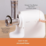 این چرخ گوشت دارای ضمیمه های متنوعی است که به راحتی قابل تعویض هستند. درپوشی که یک ضمیمه را در جای خود نگه می دارد دارای لبه ای است که گرفتن و چرخاندن آن را آسان می کند و باعث می شود که پس از خرد کردن، حتی با دست های چرب به راحتی آن را جدا کرده و جایگزین کنید.