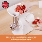 گوشت پاناسونیک مدل MK-GX1700 طراحی ساده اما شکیلی دارد و رنگ سفید و زیبای آن نظر هر سخت پسندی را به خود جلب می کند. با کمک این چرخ گوشت می توانید به یکباره مقدار زیادی گوشت را چرخ کنید. به لطف شکل عمیق تر، گوشت به راحتی در سینی قرار می گیرد. افزایش حجم سینی به شما این امکان را می دهد که در هر زمان گوشت بیشتری را روی سینی قرار داده و سپس توسط اهرم دستی به داخل لوله و تیغه ها جهت خرد شدن هدایت کنید.