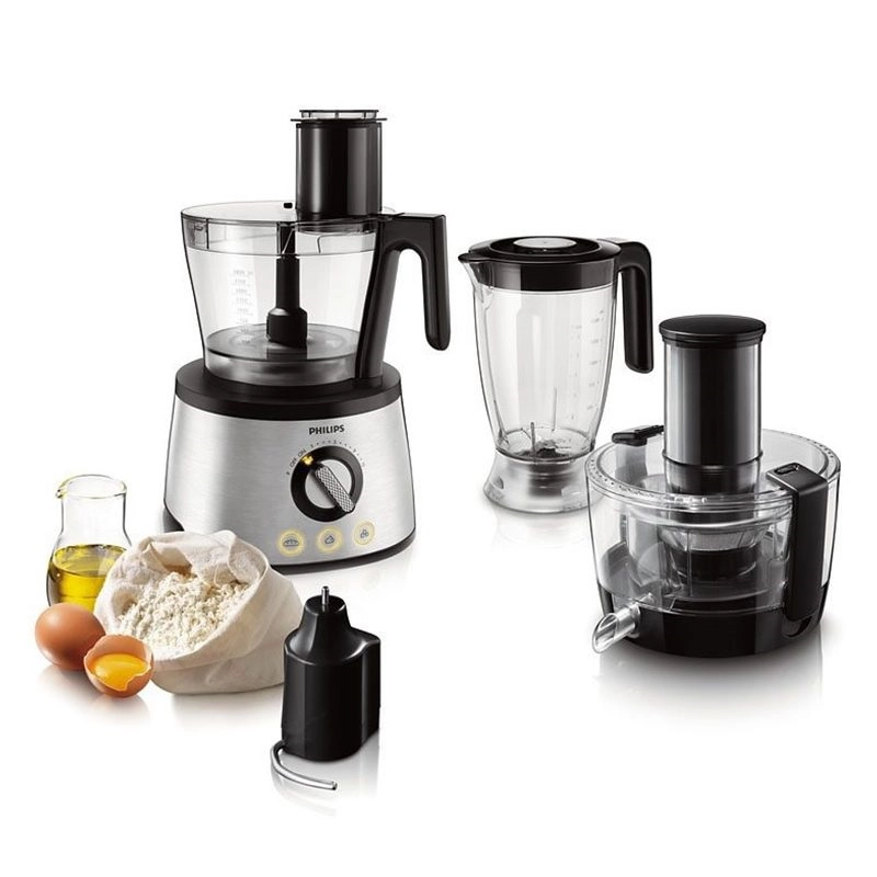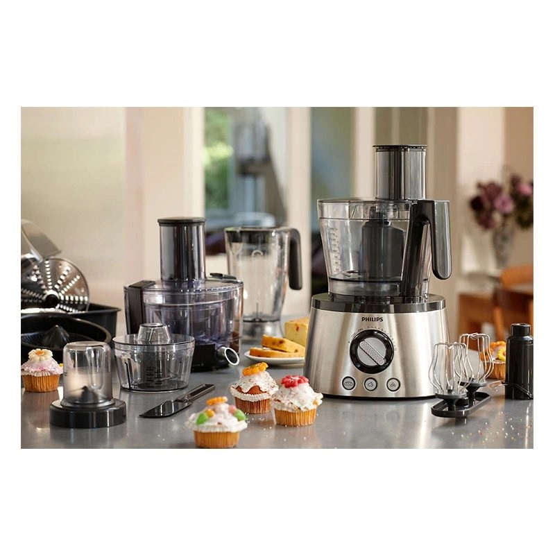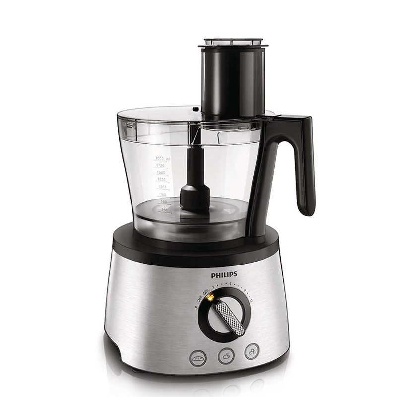 غذاساز فیلیپس مدل HR7778 با موتور قدرتمند 1300 واتی و 13 سری مختلف می تواند بیش از 30 عملکرد را برای شما انجام دهد. آب میوه گیری این دستگاه به صورت حرفه ای طراحی شده و دارای دهانه ورود میوه بزرگ است، سرعت تهیه آب میوه در آن دو برابر دیگر دستگاه ها می باشد. بدنه آبمیوه گیری از دو جداره تشکیل شده که در بخش داخلی تیغه و توری متصل به آن قرار گرفته و بخش بیرونی محل نگهداری تفاله است. آبمیوه گرفته شده از بخش داخلی توسط لوله ای که به بیرون ارتباط دارد خارج می شود. فیلتر میکرومش تهیه شده از استیل، تمام آب میوه را گرفته و در نتیجه آب میوه بیشتر و تفاله خشک تر می باشد. فیلیپس 7778 بیش از سی عملکرد دارد که شامل آسیاب، ابزار خمیر زن برای ترکیب بهتر، تیغه خردکن برای خرد کردن سبزی و گوشت، دو صفحه فلزی دو طرفه با رنده ریز و درشت، دو صفحه جهت خلال کردن سیب زمینی و میوه در دو سایز، یک صفحه تیغه ای برش دهنده با تیغه قابل تنظیم، آب مرکبات گیر، همزن دوتایی جهت تهیه مواد کیک و خامه، مخلوط کن با پارچ 1.5 لیتری و آبمیوه گیری که مهمترین بخش است، می باشد. قطعات دستگاه غذاساز HR7778 بطور کامل جدا شده و قابلیت شستشو در ماشین ظرفشویی را دارند. کاسه دستگاه دارای ظرفیت 3.4 لیتر بوده و گنجایش 2 لیتر سوپ، 1.7 کیلوگرم لبنیات و 7 سفیده تخم مرغ را دارد. موتور دستگاه دارای 12 حالت سرعت بوده و بسته به نیاز می توان از سرعت های مختلف آن استفاده کرد، همچنین می توان از حالت پالسی یا ضربه ای برای خرد کردن مواد سخت همچون یخ استفاده کرد تا فشار کمتری به موتور دستگاه وارد شود، کف دستگاه دارای 4 پایه مکشی بوده که با قرار گیری روی سطح مورد نظر به خوبی می چسبد و مانع از لغزش و لرزش هنگام کار می شود.