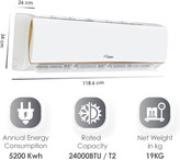 【مشخصات فنی】 نوع کمپرسور: رفت و برگشتی. منبع تغذیه: 220-240 ولت، 50 هرتز. وزن ناخالص داخل سالن: 23 کیلوگرم. وزن خالص داخلی: 19 کیلوگرم. وزن ناخالص در فضای باز: 71 کیلوگرم. وزن خالص در فضای باز: 62 کیلوگرم. ابعاد توری داخلی: 118.6x34x26cm. ابعاد ناخالص داخلی: 126.2x42x33.7 سانتی متر. ابعاد توری فضای باز: 95.3x43.3x80.8 سانتی متر. ظرفیت رتبه بندی T3 - 22100 BTU/H. مصرف سالانه انرژی: 5200 کیلووات ساعت در سال. امتیاز 2 ستاره ESMA نوع آب و هوا: T3. دبی تخلیه هوا: 1600. نوع مبرد: R410a. یک سال گارانتی.
