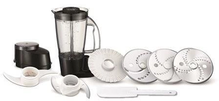 این دستگاه دارای 9 اکسسوری است، یک خردکن 3 لیتری بزرگ با ظرف لاک و تیغه ی خردکن تمام استیل، سه عدد دیسک رنده و برش، یک عدد دیسک پلاستیکی مخصوص مایعات، پارچ مخلوط کن 1.2 لیتری و یک عدد مینی خردکن کوچک