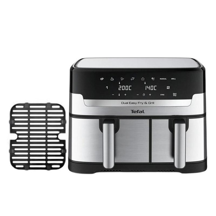 سرخ کن دوقلو تفال مدل EY905D از نسل جدید لوازم پخت و پز این برند معتبر است. طراحی منحصربهفرد و جذاب این محصول به همراه قدرت پخت بالا و آمادهسازی سریع مواد غذایی از جمله ویژگیهای ارزشمند در خرید آن به شمار میرود. اولین نکته جذاب در ساخت دستگاه، برخورداری از دو مخزن پخت کشویی با ابعاد متفاوت است. ظرفیت مخزن بزرگتر 5.2 لیتر و مخزن کوچکتر 3.1 لیتر بوده که در مجموع حجمی معادل 8.3 لیتر را برای پخت انواع مواد غذایی در اختیار شما قرار میدهد. از همین رو با توجه به این ظرفیت قادر به تهیه وعده موردنظر برای جمعهای خانوادگی و مهمانیها خواهید بود. در ساخت بخش عمدهای از بدنه این سرخ کن بدون روغن تفال از استیل ضدزنگ استفاده شده و سایر بخشها آن را پلاستیک و پنل شیشهای تشکیل میدهد. پنل کاربری این سرخ کن هوشمند شامل 7 برنامه خودکار و 1 برنامه دستی پخت و پز است که طیف گستردهای از محبوبترین غذاهای شما را در برمیگیرد. علاوه بر این میتوانید هر مخزن را به صورت مجزا، از طریق برنامههای پیشفرض و یا تنظیمات دستی زمان و دما کنترل کنید. همچنین از طریق عملکرد Sync امکان تکمیل فرآیند پخت دو مخزن در یک زمان را خواهید داشت. این امر موجب میشود تا وعدهها 40 درصد سریعتر -بدون نیاز به پیش گرم کردن مخزن پخت- و با صرفهجویی در مصرف انرژی آماده شوند. یکی دیگر از عملکردهای سرخ کن دوقلو تفال مدل TEFAL EY905D، عملکرد گریل است. به گفته این کمپانی فرایند گریل با استفاده از این دستگاه به نسبت روشهای سنتی با کاهش ۹۸ درصدی انتشار دود به محیط پیرامون انجام میشود. یکی دیگر از المانهای مهم در انتخاب این هواپز، امکان تهیه وعدههایی کاملا سالم است. سیستم گردش ۳۶۰ درجهای هوای داغ موجب شده تا نیاز به مصرف روغن برای پخت مواد غذایی تا میزان ۹۹% کاهش یابد. لوازم جانبی این محصول شامل یک صفحه مختص سرخ کردن و یک صفحه گریل از جنس دایکاست بوده که امکان شستشوی آسان این اجزا به همراه مخزنهای پخت به وسیله ماشین ظرفشویی وجود دارد.