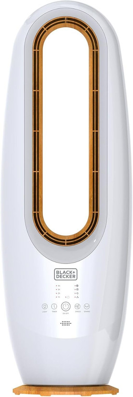 BLACK + DECKER 2 در 1 فن بدون پره، 85 سانتی متر، موتور تروپیکال 70 وات، لامپ LED سرد-سفید، کنترل از راه دور، نوسان عریض 60 درجه، کم صدا، تزئینات چوبی، روکش 40 متر مربع، سفید - FBL85-B5