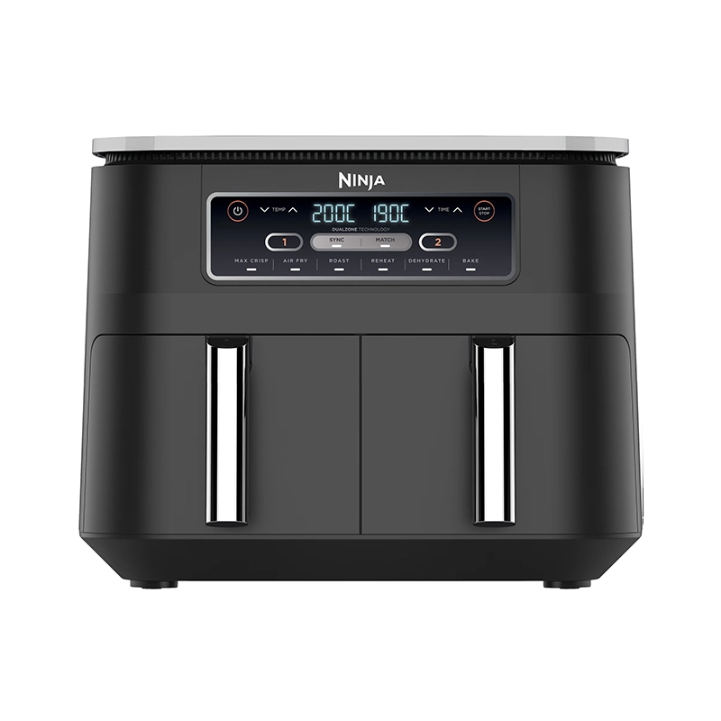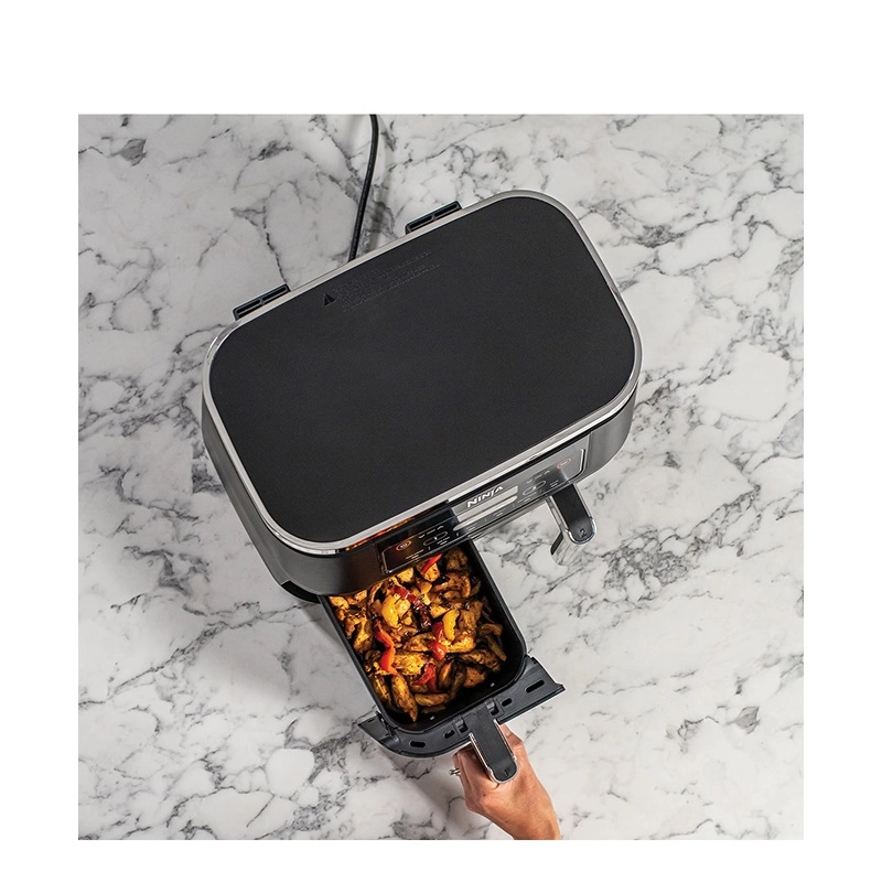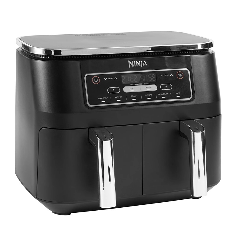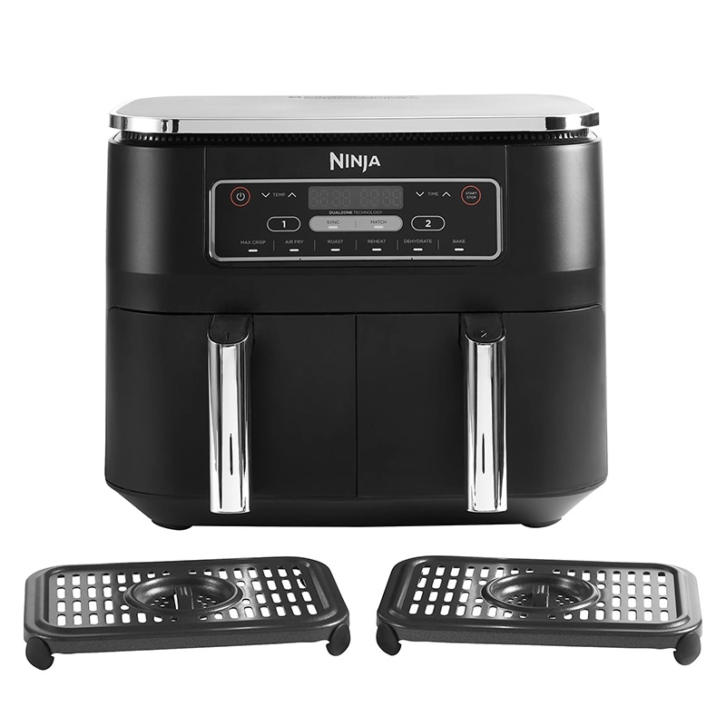 سرخ کن نینجا مدل AF300 اولین هواپز با دو سبد مستقل با ظرفیت ۳.۸ لیتری است که به شما امکان تهیه همزمان دو نوع غذا به دو روش مختلف را میدهد. این ویژگی امتیاز منحصربهفرد این دستگاه در مقایسه با سرخ کنهای تک سبد سنتی بهشمار میآید. وجود ۶ برنامه پیش فرض قابل تنظیم امکان تهیه طیف گستردهای از غذاهای موردعلاقه شما را سریعترین زمان ممکن و بهآسانی در اختیار شما قرار میدهد. این دستگاه را میتوان در دسته سرخ کنهای کم روغن و بدون روغن قرار داد که با استفاده از المنت و فن، هوای داغ داخل خود را به گردش درمیآورد تا مواد غذایی را به صورت یکدست برای شما آماده کند. با گردش هوای گرم روغن و یا چربی داخل بافت مواد غذایی شما آزاد میشود و حرارت بهصورت یکدست به تمام مواد غذایی شما میرساند و آنها را سرخ میکند. این سرخ کن مصرف روغن شما را تا میزان ۷۵% کاهش میدهد.