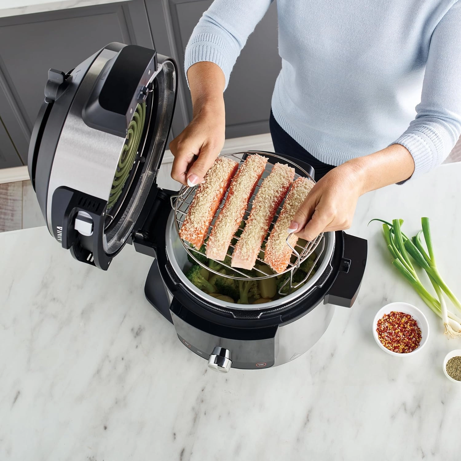 کاسه ۷.۵ لیتری این مولتی کوکر نینجا ظرفیتی ایدهآل را برای تهیه وعده غذایی ۶ نفره در اختیار شما قرار میدهد. این ظرفیت معادل پخت یک مرغ بزرگ ۳ کیلوگرمی است. علاوه بر این، یک سبد ۴.۷ لیتری دیگر برای انجام فرایند پخت و سوخاری کردن مواد غذایی به عنوان اقلام جانبی برای دستگاه در نظر گرفته شده. این سبد نیز ظرفیتی معادل سرخ کردن ۱.۸ کیلوگرم سیب زمینی را دارد. متریال ساخت این کاسه و سبد از جنس سرامیک نانو نچسب است. یک قفسه دو طبقه به همراه دو سینی توری فلزی برای انجام فرایندهایی مثل گریل و بخارپز کردن مواد غذایی دیگر اقلام این محصول را تشکیل میدهد. گفتنی است تمامی اقلام جانبی قابلیت شستشو در ماشین ظرفشویی را دارند.