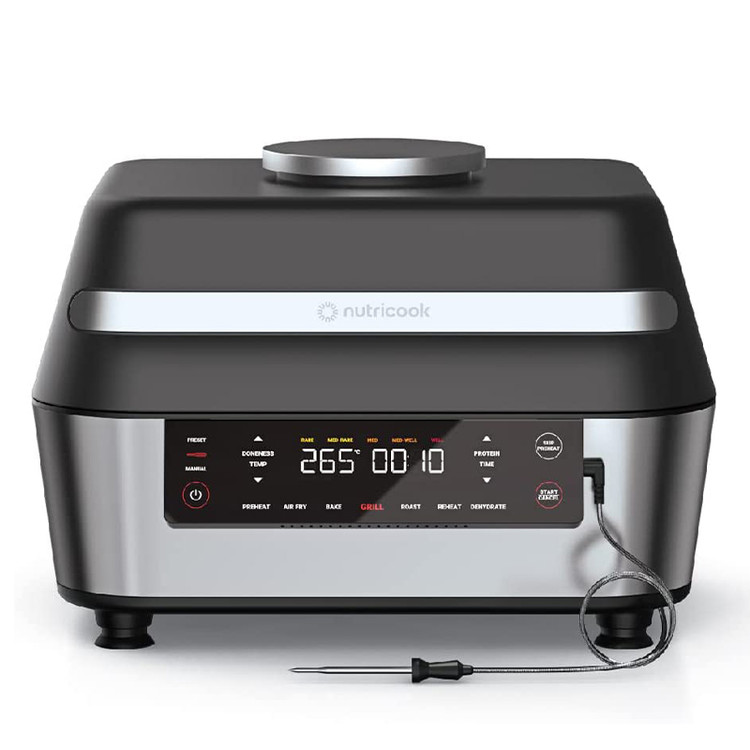 یکی دیگر از ویژگیهای ارزشمند این سرخ کن و گریل برند نوتریکوک برخورداری از قطعه دماسنج هوشمند است. بهکمک این قطعه و با وارد کردن سری حسگر دمایی آن به داخل مواد غذایی هر لحظه از میزان دما و در نتیجه روند پخته شدن آن مطلع خواهید شد. همین موضوع موجب میشود تا فرایند پخت و پز بدون هیچ حدس و گمان و با نتیجهای کاملا دلخواه بهانجام برسد.