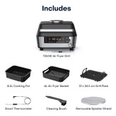 درون جعبه دستگاه علاوه بر قطعه اصلی، لوازم جانبی بسیار کارا قرار دارد. ظرف ۸.۵ لیتری پخت، سبد ۶ لیتری مختص سرخ کردن، صفحه مختص گریل به ابعاد ۳۱ در ۲۴.۵ سانتیمتر، دماسنج هوشمند، قطعه اسپلتر محافظ برای جلوگیری از انتشار دود و بو به فضای آشپزخانه و برس نظافت، لوازم جانبی این دستگاه را تشکیل میدهد.