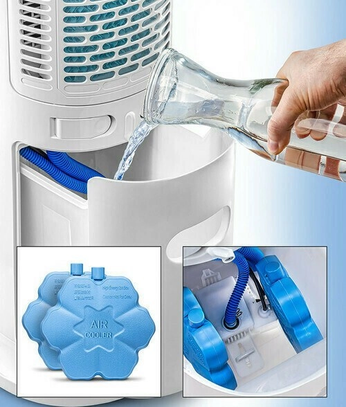 جعبه کریستال یخ موجود در مخزن را می توان بارها منجمد استفاده کرد. درپوش باکس کریستال یخ نباید باز شود و مواد داخل آن برای جلوگیری از آسیب به محیط و دستگاه نباید تراوش کند. مواد سازنده جعبه کریستال یخ سازگار با محیط زیست، غیر سمی و بی ضرر است که می توان آن را با خیال راحت در یخچال برای انجماد قرار داد. جعبه کریستال یخ منجمد باید در مخزن آب استفاده شود و پس از روشن شدن دمای خروجی هوا کاهش می یابد. جعبه کریستال یخ را می توان با یخ جایگزین کرد و از یخ معمولی برای خنک کردن آب و جریان هوا استفاده نمود.