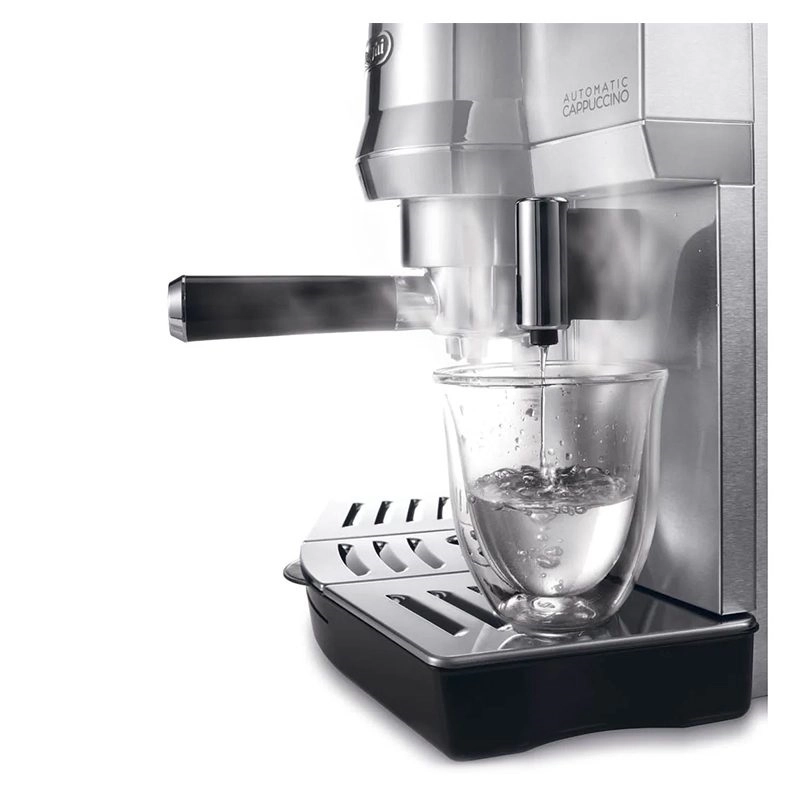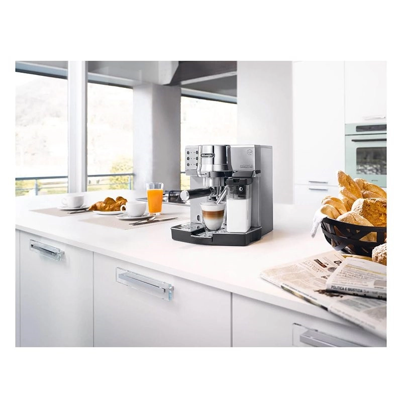 اسپرسو دلونگی مدل EC850.M دستگاهی با امکانات خوب و مدرن برای تهیه انواع قهوه است. جنس بدنه دستگاه استیل ضد زنگ می باشد که این استحکام زیبایی فوق العاده ای به محصول داده است. توان این دستگاه 1450 و فشار بخار 15 بار است که فشار بخار در این مدل باعث شده تا قهوه با کیفیت و خوبی تهیه شود. این دستگاه برای نگهداری دانه قهوه مخزنی نداشته و باید از قهوه آسیاب شده استفاده کرد. نوشیدنی های قابل تهیه با EC850.M کاپوچینو، اسپرسو، لاته ماکیاتو، آمریکانو، آب داغ و شیر داغ می باشد. همچنین مخزن آب با ظرفیت 1 لیتر در پشت دستگاه و مخزن شیر در جلوی دستگاه قرار دارد. طراحی این دستگاه طوریست که جایگاهی برای نگهداری فنجان در نظر گرفته شده است. مصرف انرژی این مدل بسیار پایین است و در رده انرژی A قرار می گیرد.