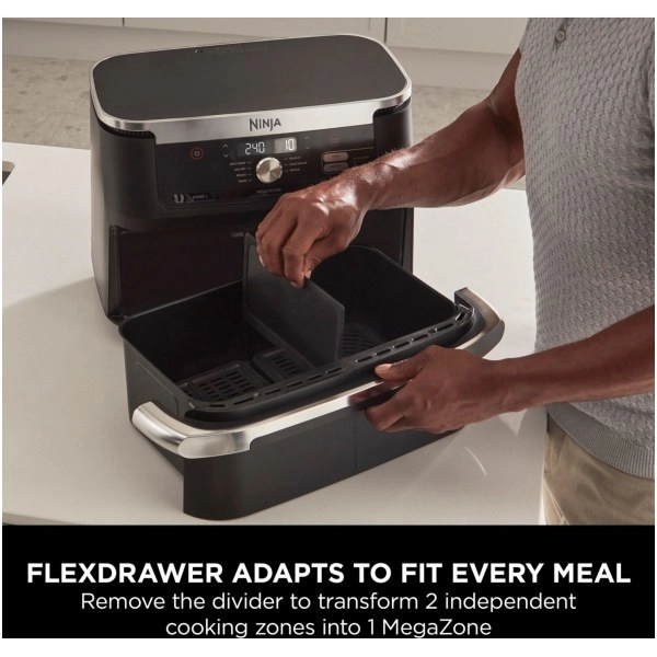 سرخ کن نینجا مدل AF500 با ظرفیت 10.4 لیتری خود آماده است تا در هر وعده حجم بالایی از مواد غذایی را تهیه کند. علاوه بر این میتوانید از طریق قراردهی قطعه جداکننده سبد را به دو بخش مساوی 5.2 لیتری تقیسم کرده، پس از اعمال برنامه پخت و تنظیمات دستی دما و زمان برای هر سبد، با همگامسازی (Sync) زمان اتمام آشپزی، وعدهها را بدون تقدم و تاخر در اختیار داشته باشید. همچنین میتوانید تنظیمات دلخواه خود را به صورت مشابه از طریق عملکرد Match روی هر دو سبد اعمال کنید. گفتنی است هر سبد 5.2 لیتری ظرفیتی معادل پخت یک مرغ 2 کیلوگرمی یا 1.5 کیلوگرم سیب زمینی سرخ کرده را دارد.