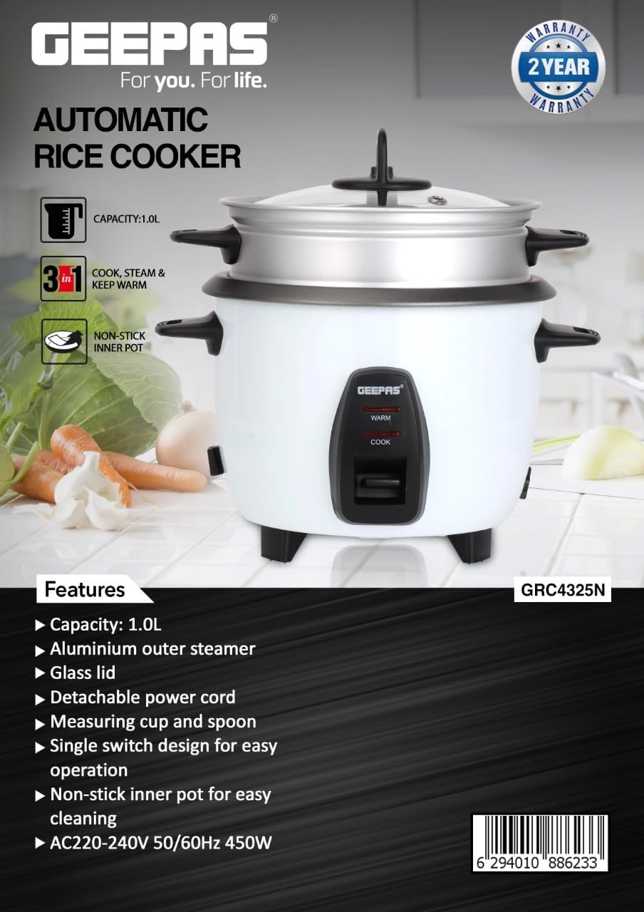 پلوپز جیپاس مدل GRC4325 طراحی زیبا و بدنهای بادوام دارد. پایههای آن ضد لغزش است که دستگاه را محکم در جای خود نگه میدارند. طراحی جمع و جور و زیبا دارد. فضای کمتری را میپوشاند و پیشخوان آشپزخانه شما را شلوغ نمیکند. پلوپز جیپاس مدل GRC4325 دارای ظرفیت بزرگ 1 لیتر است. اکنون میتوانید وعدههای بزرگ برای کل خانواده درست کنید یا با مهمانان ناگهانی مقابله کنید چرا که این پلوپز بسیار سریع و کارآمد است. بسته بندی شامل یک پیمانه و قاشق است. فنجان اندازه گیری به پخت و پز شما دقت میکند و با قاشق برنج میتوانید برنج را به راحتی بیرون بیاورید. این پلوپز دارای درب محکمی است که از شیشه سکوریت ساخته شده است. دارای یک لبه استیل ضد زنگ است که آن را در جای خود ثابت میکند. دود نمیگیرد و به شما امکان میدهد برنج خود را در حال پختن تماشا کنید. پلوپز جیپاس مدل GRC4325 دارای دستههای لمسی خنکی است که از مواد با کیفیت ساخته شدهاند و استفاده از آنها در حین پختن دستگاه بی خطر است.