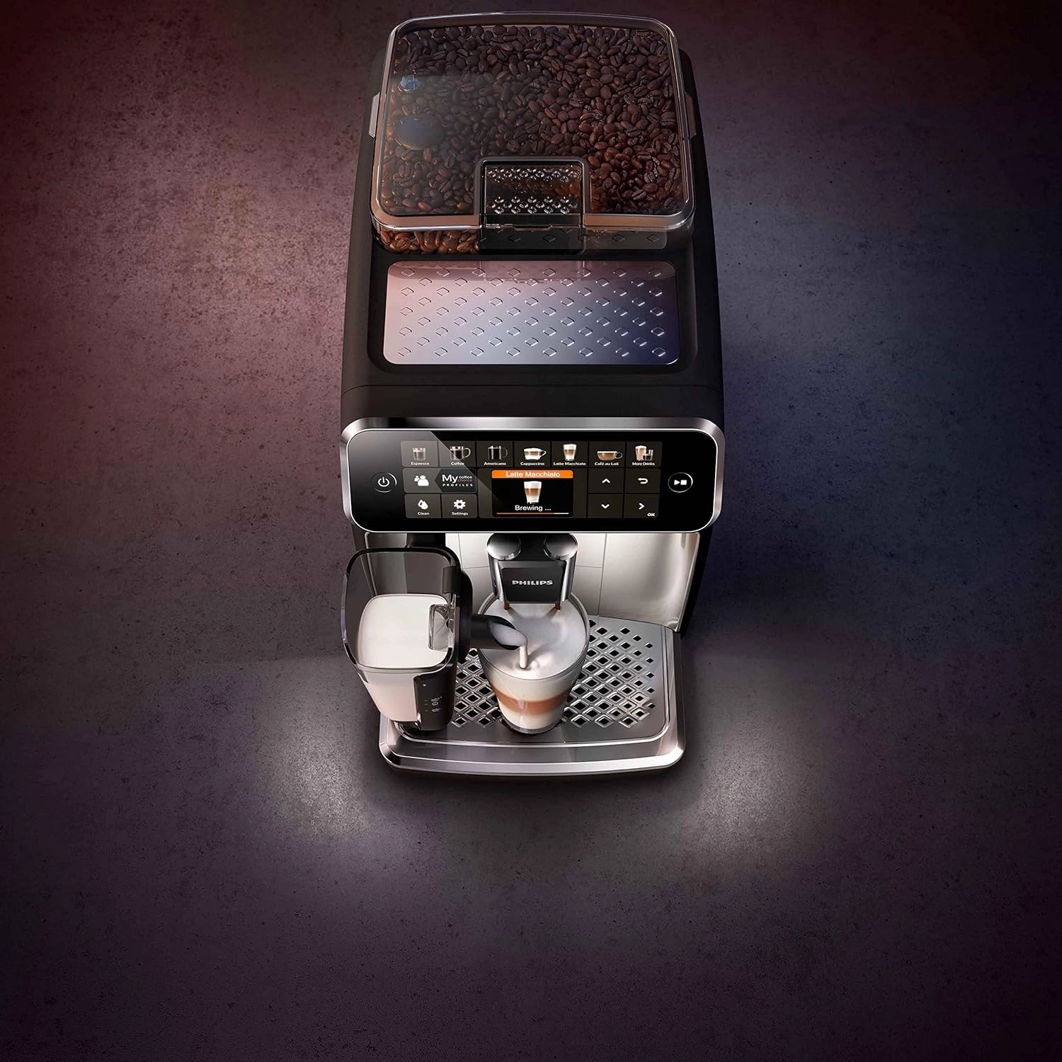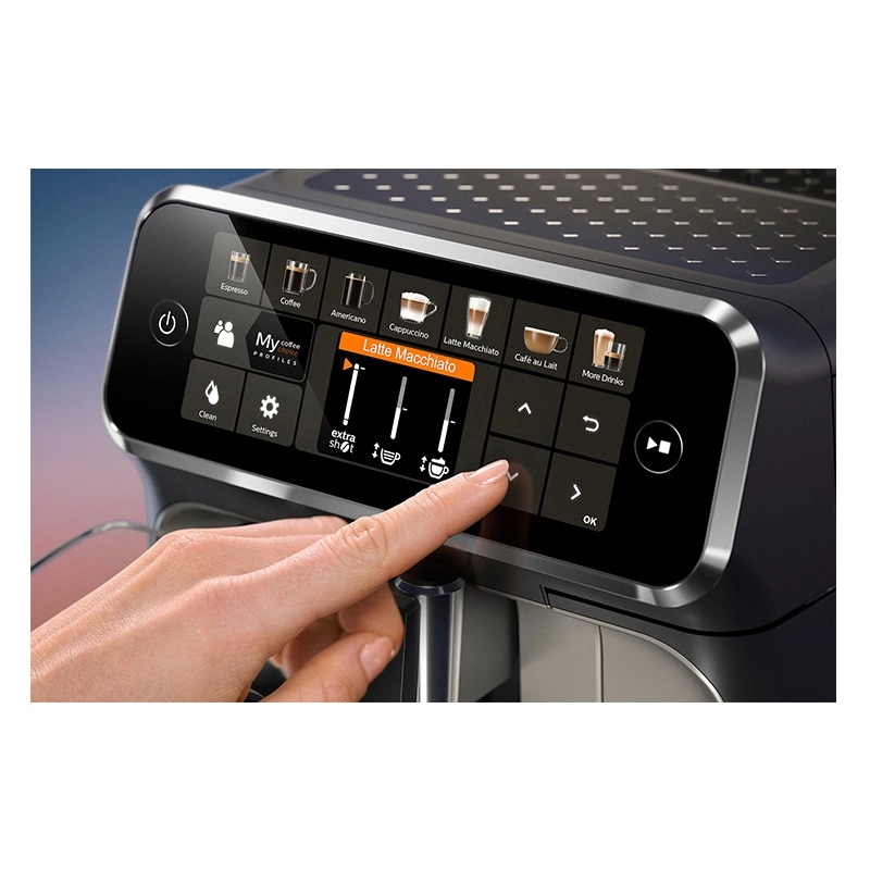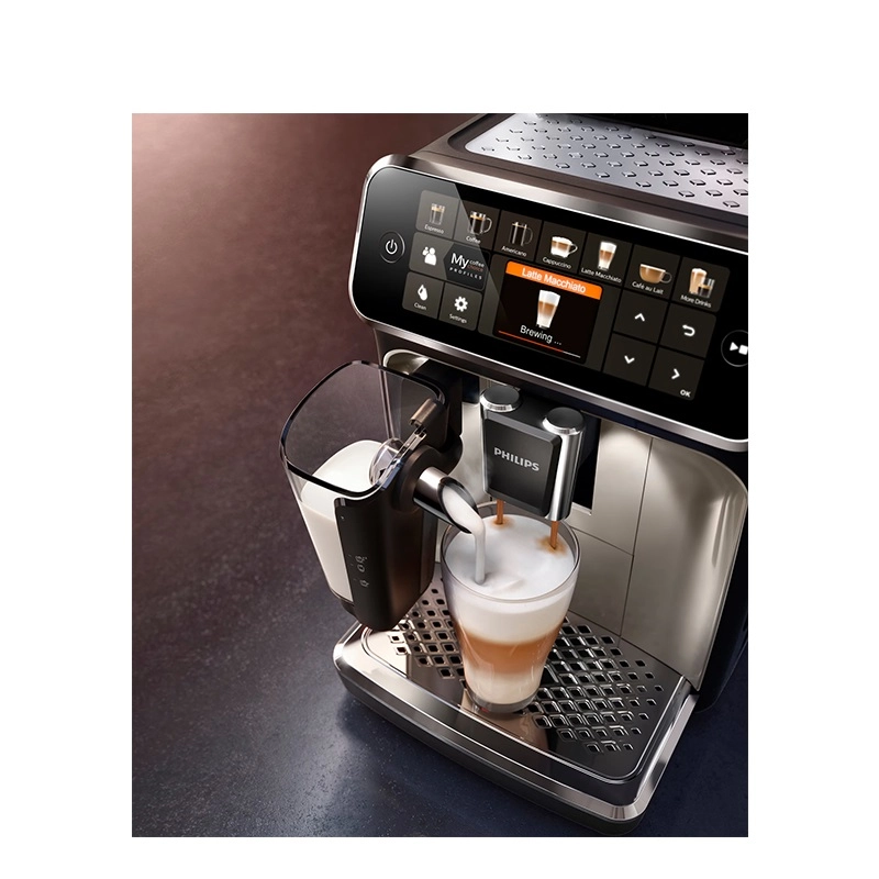 اسپرسوساز فیلیپس مدل EP5447 تمامی نیازهای شما در جهت انجام کلیه مراحل تهیه نوشیدنی موردنظر را مرتفع کرده و با توجه به توانایی ارائه امکاناتی در سطح بالا قادر است یک کافی شاپ کوچک را به خانه شما بیاورد. از ابتداییترین فرایند تهیه یک فنجان قهوه یعنی آسیاب دانهها گرفته تا تهیه یک نوشیدنی خوش طعم همگی به کمک این دستگاه به صورت تمام اتوماتیک قابل انجام است. طراحی ویژه این محصول با برخورداری از صفحه کنترل لمسی و نمایشگر TFT با رابط کاربری آسان، دستگاهی خوشساخت را تشکیل داده است. بهرهگیری این دستگاه از توان 1500 وات، مخزن آب 1.8 لیتری و میزان فشار 15 بار به لطف وجود سیستم گرمایش بلوک حرارتی موسوم به Thermoblock تهیه نوشیدنی موردنظر با بالاترین کیفیت ممکن را تضمین میکند. 12 نوع برنامه برای تهیه انواع نوشیدنی را در اختیار خواهید داشت؛ از یک نوشیدنی اسپرسوی خوشطعم تا یک کاپوچینوی ایدهآل از طریق این اسپرسوساز تمام اتوماتیک فیلیپس قابل تهیه خواهد بود. وجود سیستم LatteGo در اسپرسوساز فیلیپس مدل EP5447 موجب شده با سرعتی بالا به کف شیری ابریشمی دست پیدا کنید. نوشیدنی قهوه خود را با لایهای ابریشمی و صاف از کف شیر بپوشانید. این سیستم با ترکیب شیر و هوا با سرعت بالا در درون مخزن شیر، یک لایه کرمی کامل از شیر را ارائه میدهد. صفحه لمسی اسپرسوساز در کنار نمایشگر TFT با برخورداری از رابط کاربری قوی، تعویض بین فرایندهای موردانتظار شما را در سریعترین زمان و به بهترین شکل ممکن به انجام میرساند. امکان تنظیم میزان عطر و طعم قهوه و مقدار موردمصرف، اشرافی کامل را از تمامی مراحل انجام فرایند تهیه نوشیدنی در اختیار شما قرار میدهد. وجود عملکرد شات اضافی، مقدار شدت طعم نوشیدنی را بدون افزیش میزان تلخی آن، بالا خواهد برد. همچنین اسپرسوساز فیلیپس مدل EP5447 به لطف وجود سیستم Aroma Extract با ایجاد تعادل بهینه بین دمای دمآوری و عطر قهوه با نگهداری دمای آب بین 90 و 98 درجه سانتیگراد تهیه نوشیدنی موردنظر با بالاترین کیفیت ممکن را تضمین میکند. جنس مخزن آسیاب دستگاه از سرامیک بادوام بوده که با حفظ عطر طبیعی قهوه حاضر است تا میزان 20000 فنجان پودر قهوه را تهیه کند. میزان آسیاب دانههای قهوه بسته به مقدار دلخواه شما در 12 درجه قابل تنظیم خواهد بود. وجود دو نازل امکان تهیه دو فنجان قهوه را مهیا میکند. این نازلها بسته به میزان ارتفاع فنجان و یا لیوان شما قابل تنظیم بوده که این امر از پاشیدن نوشیدنی به خارج از سطح فنجان جلوگیری میکند. نگران وجود رسوب در آب نباشید؛ تعبیه فیلتر AquaClean در مخزن آب موجب شده این قطعه نیازی به رسوب زدایی مداوم دستگاه نداشته و همواره آب را شفاف نگه میدارد بطوریکه تا حداکثر 5000 فنجان احتیاجی به فرایند رسوب زدایی نخواهد داشت. همچنین عملکرد خودکار دستگاه با قابلیت تنظیم میزان سختی آب شما را در مواقعی که دستگاه نیازمند انجام رسوب زدایی است، مطلع خواهد کرد. وجود سیستم ذخیره انرژی و نظافت آسان دستگاه به لطف قابلیت تفکیک قطعات و امکان شستشوی آنها در ماشین ظرفشویی از دیگر امکانات اسپرسوساز فیلیپس مدل PHILIPS EP5447 به شمار میآید.