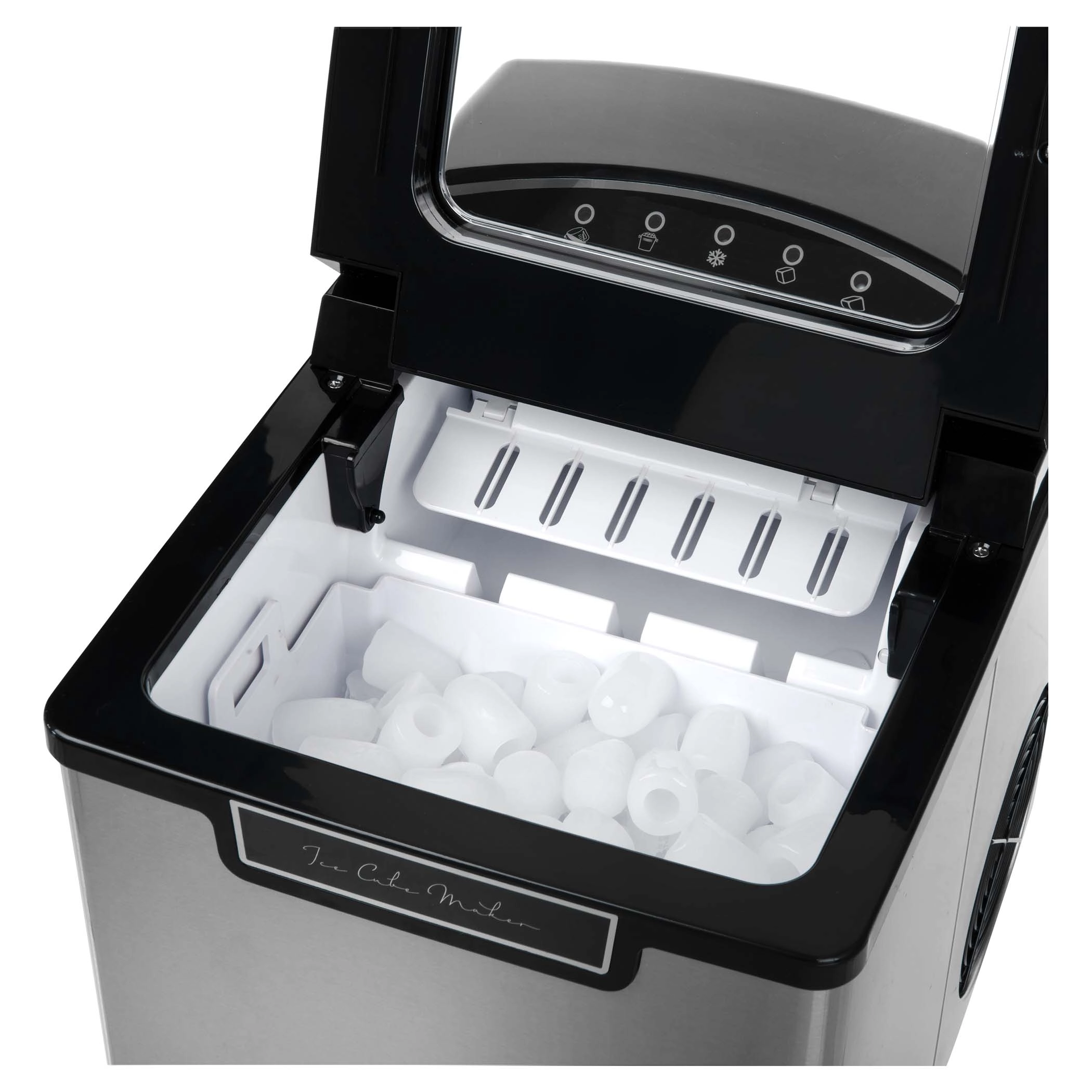 با استفاده از این یخ ساز می توانید یخ کلاهی شکل کاملا شفاف و بدون حباب هوا را در کمترین زمان آماده کنید یا بطری آب و نوشابه را خنک کنید. این یخ ساز حرفه ای دارای مخزن 1.9 لیتری است و هر بار توانایی درست کردن 9 مکعب یخ را دارد و می توانید بنابر نیاز خود تکه های یخ کوچک یا بزرگ را از دستگاه بخواهید و اندازه تکه های یخ را انتخاب کنید و سپس دکمه استارت را بزنید. بنابراین دیگر لازم نیست نگران نداشتن فریزر برای درست کردن و نگهداری یخ باشید. لازم به ذکر است که دسته این دستگاه جهت حمل کردن راحت تر، کاملا ارگونومیک طراحی شده است.